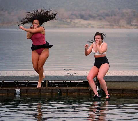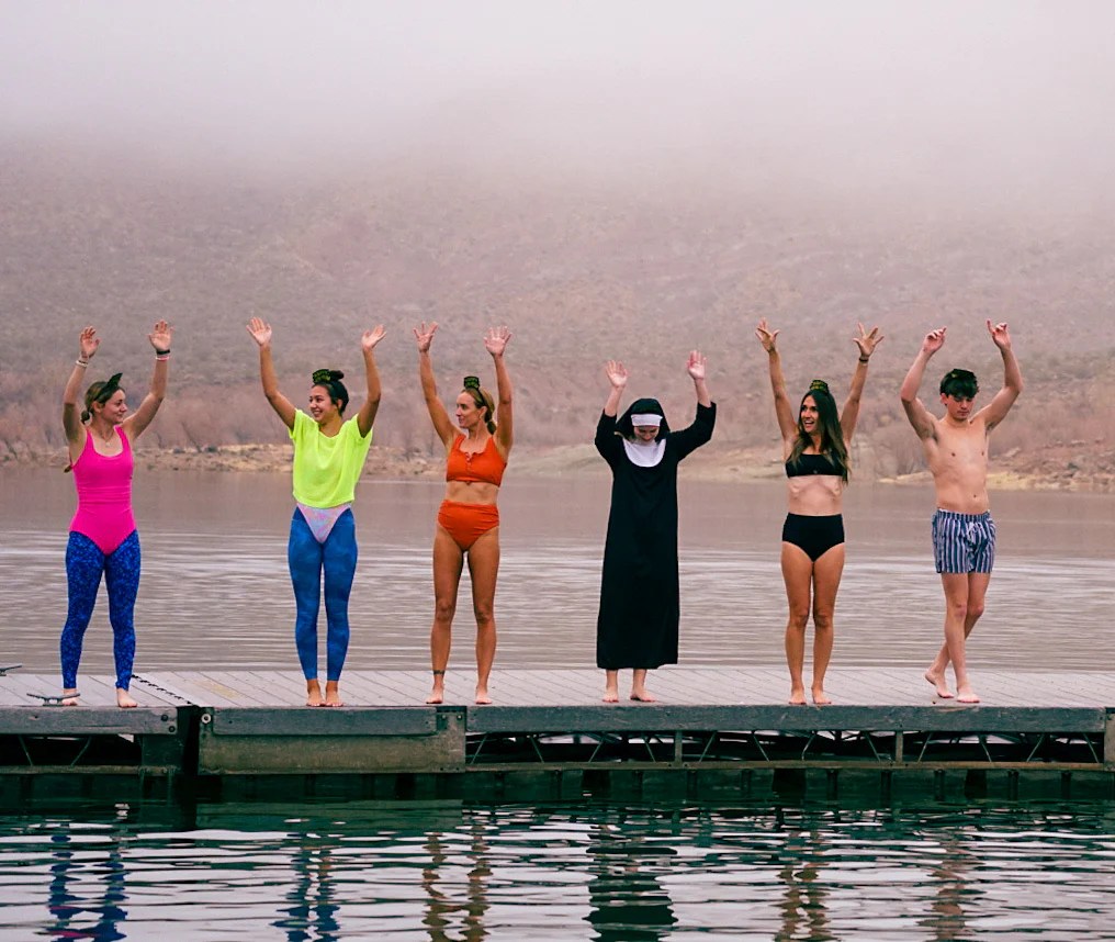 Participants jumping into the lake are encouraged to dress up, and these costumes get better and better every year. Costumes have ranged from Scottish Kilts, Baby New Year, Santa, a group of Nuns, Wonder Woman, Nacho Libre, and a pineapple. But it was the jumping Nun that took first prize this year. We have added one more prize for the most jumps! This year we had a record-breaking seven jumps by two friends, Leilani Finlayson and Ashlynn Apffel. Beating last year’s record of five. As participants exited the cold lake we had a fire pit, warming tent, and hot chocolate waiting for them. January 1st, 2024 is already on the calendar, go ahead and dare your friends to join you next year.